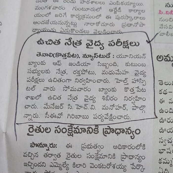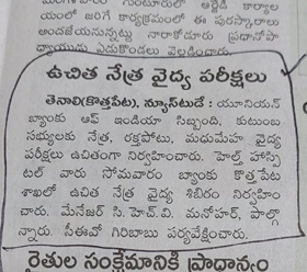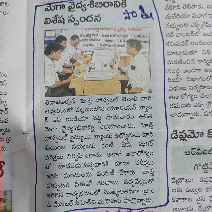 Free Health Camp at Union Bank of India, Tenali